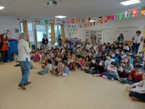 Ce matin, l’ensemble des élèves et des enseignantes s’est réuni pour vivre un temps particulier : dire au revoir à Sœur Nadia, qui intervenait en catéchèse auprès des élèves de CM1 et tous les jeudis pour l’étude du soir.